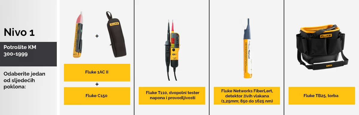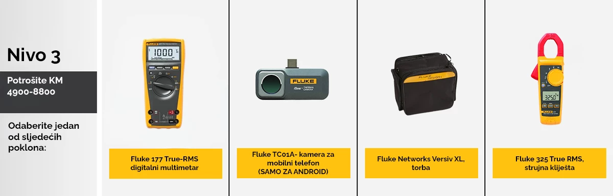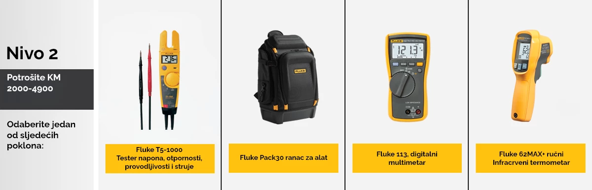 Prilikom kupovine proizvoda iz programa Fluke Industrial, Fluke Calibration i Fluke Networks u vrijednosti iznad 300 KM + PDV, dobijte poklon u vidu dodatnog besplatnog FLUKE proizvoda. Što je veća vrijednost Vaše kupovine, veće je vrijednost poklona.