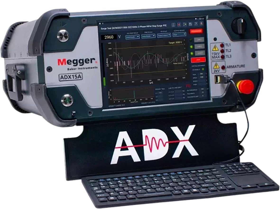 - ADX obitelj uključuje modele dizajnirane za izvođenje testova pri naponima do 15 kV. Pet glavnih opcija napona uključuju 4 kV, 6 kV, 12 kV, 15 kV, a svaki opseg napona ima dodatne opcije za testiranje niskonaponskog namotaja, djelomično praznjenje i testiranje rotora. Povežite ADX s PPX-om za povećanje testnih napona do 40 kV za testiranje visokonaponskih sredstava.