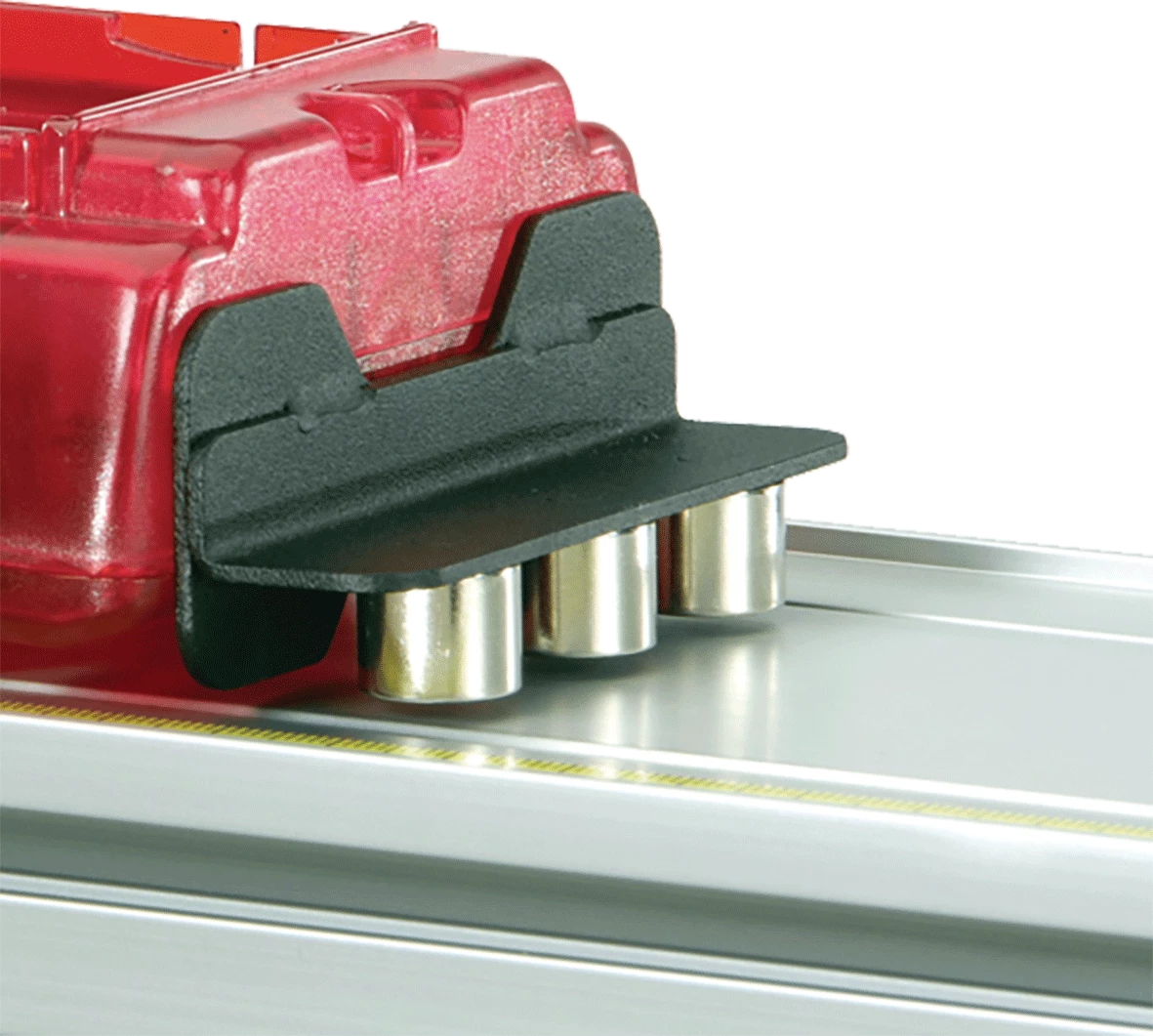 - Pribor za magnetno prigušivanje može se koristiti s Dinamičkim kolima, Smart kolima ili PAScarom. Čelični nosač pribora privlače magneti ugrađeni u kola (ili Magnetni branik na Smart kolima), a nosač se lako pomiče gore i dolje za podešavanje nivoa prigušivanja. Magnetski otpor uzrokuje struje indukovane u aluminijskoj stazi i približno je proporcionalan brzini kola. Ovaj pribor neće raditi s plastičnim stazama!