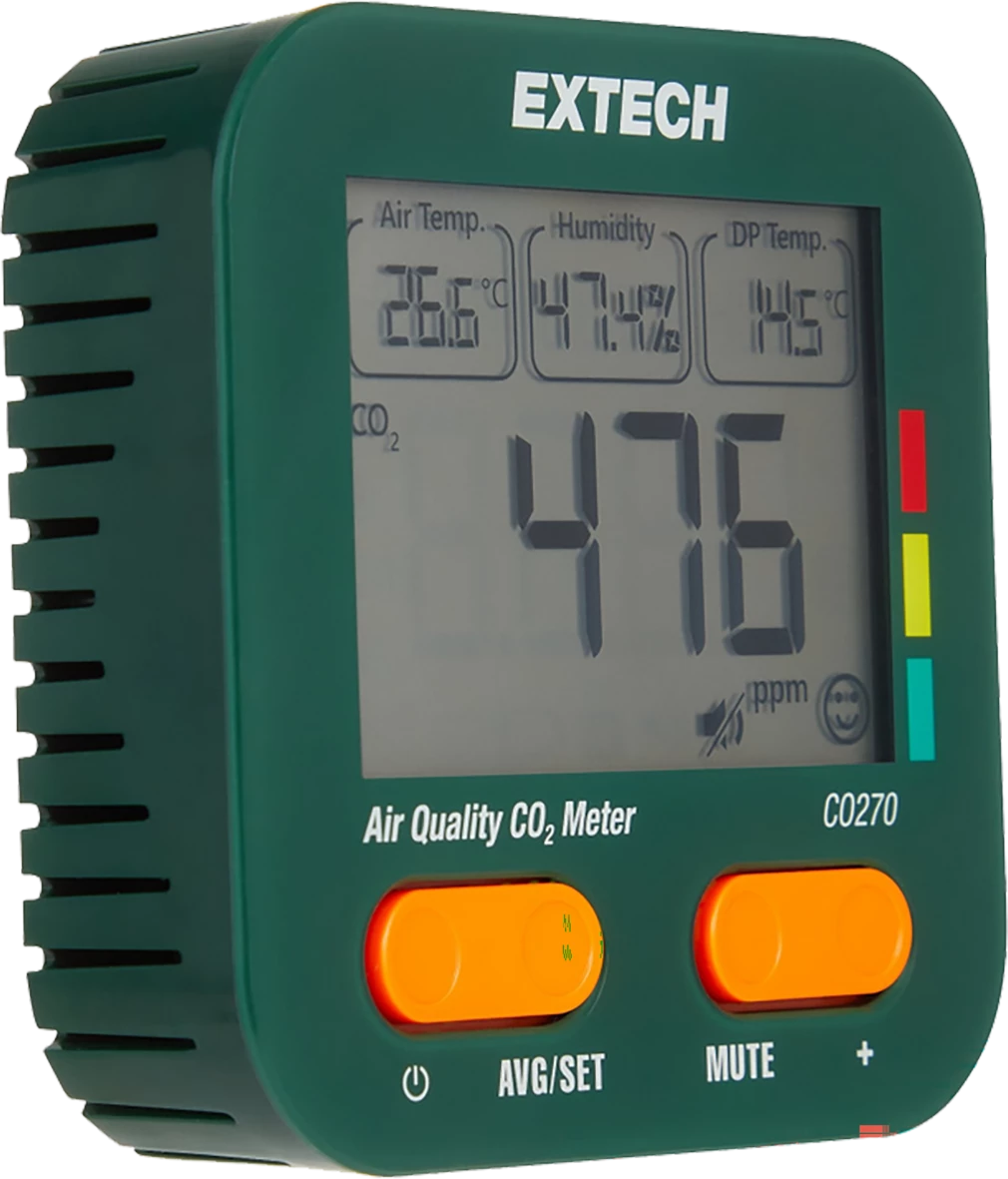 - Ugljen dioksid [CO2] od 0 do 9999 ppm, tačnost ±50 ppm ili ±3% od očitanja, rezolucija 1 ppm
