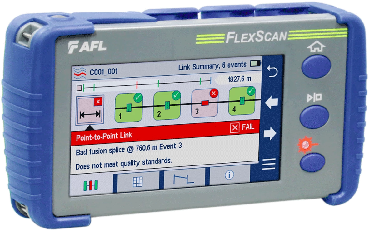 FlexScan FS200 OTDR kompanije AFL je sve-u-jednom rješenje za detektovanje, identifikovanje, lociranje i rešavanje problema jednotalasne optičke mreže. Dizajniran je za tehničare početnike i stručnjake koji rade u različitim okruženjima, od mreže FTTH PON do point-to-point mreža. Primjenjuje se industrijski standard ili postavljene korisničke kriterijume prolaza/neuspeha i prikazuje rezultate koristeći LinkMap ikone u boji za prikaz stanja mreže. FlexScan automatizuje postavljanje testa, skraćuje vreme testiranja i pojednostavljuje interpretaciju rezultata, što poboljšava efikasnost i smanjuje troškove.