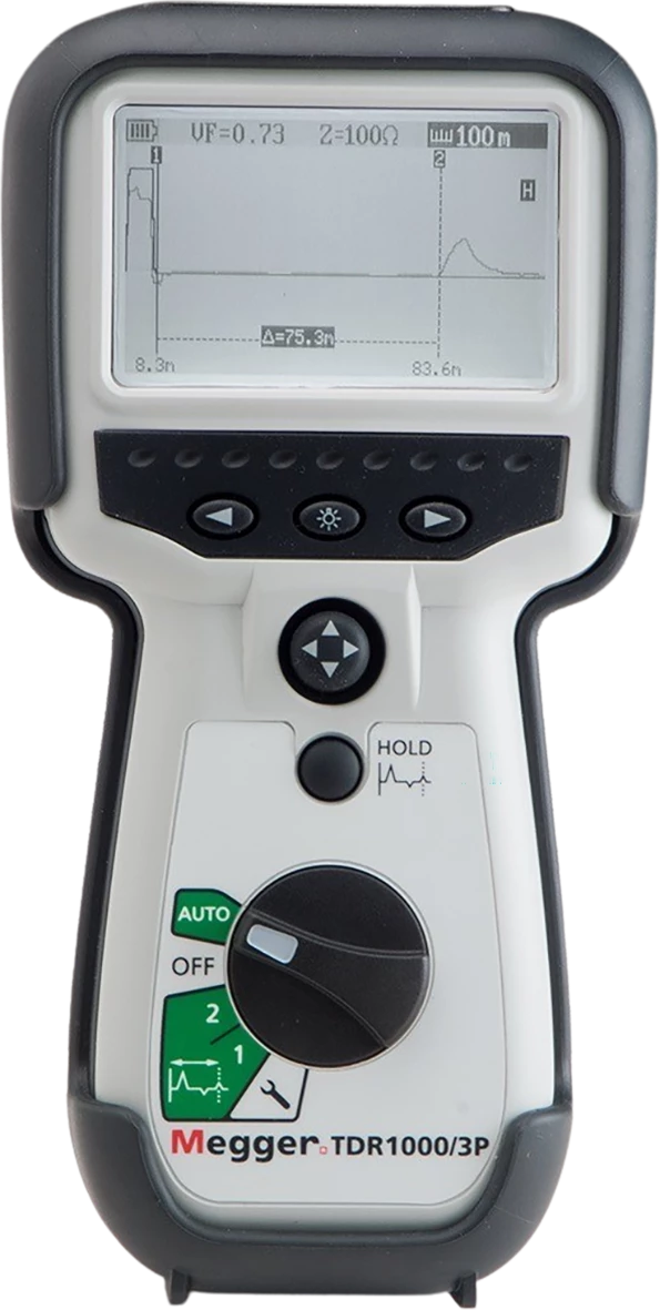 - TDR1000/3P je ručni, kompaktni Time Domain Reflectometer za otkrivanje kvarova na metalnim kablovima. Ima minimalnu rezoluciju od 0.1 m/0.3 ft i maksimalni domet od 5 km/15 kft, zavisno od izabranog faktora brzine i tipa kabla. Dostupne su četiri izlazne impedanse (25, 50, 75 i 100 Ω) i faktor brzine između 0.2 i 0.99 će zadovoljiti sve zahtjeve za testiranje kabla. TDR1000 ima jednostavnu opciju odabira koja, uz četverosmjernu kontrolnu prekidač, nudi intuitivni rad za korisnika.
