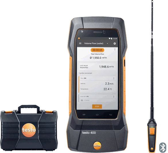 - testo 400 univerzalni IAQ instrument, uključujući transportni kovčeg za mjerenje volumena protoka, silikonske cijevi, glavnu jedinicu s USB kablom